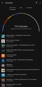Beim Podcast-Konsum gab es keine großen Veränderungen. Ich bin weiterhin großer Fan von Themen wie Technologie, Wirtschaft und Nachrichten und habe meine Abo-Liste von 20 auf 26 Podcasts erweitert. Als treuer AntennaPod-Nutzer konnte ich meine Hörgewohnheiten präzise verfolgen und bin auf eine Gesamthörzeit von 791,9 Stunden gekommen – das entspricht unglaublichen 47514 Minuten!
