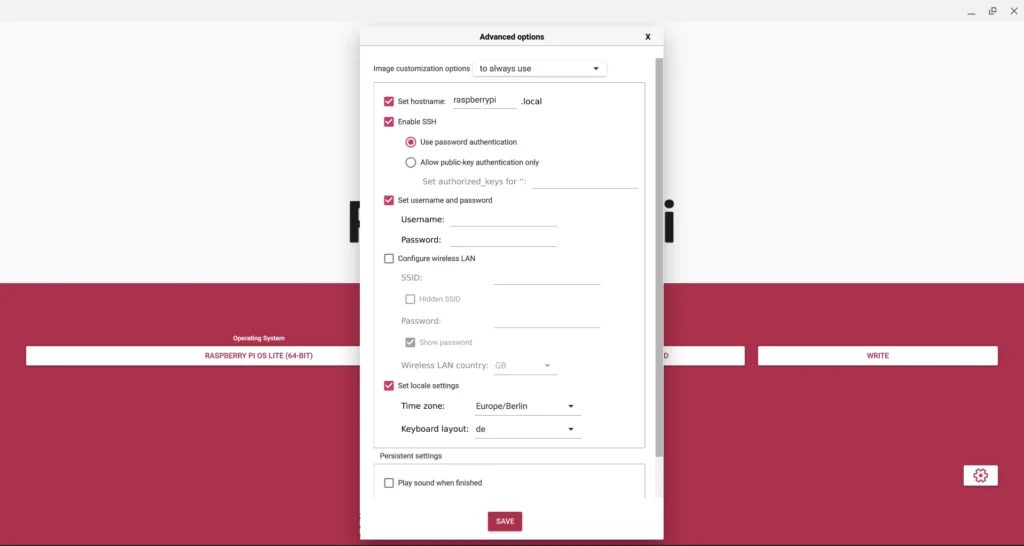 Nachdem diese Einstellungen vorgenommen wurden, kann das Fenster über Speichern (Save) geschlossen und das Schreiben (Write) auf die MicroSD Karte gestartet werden.